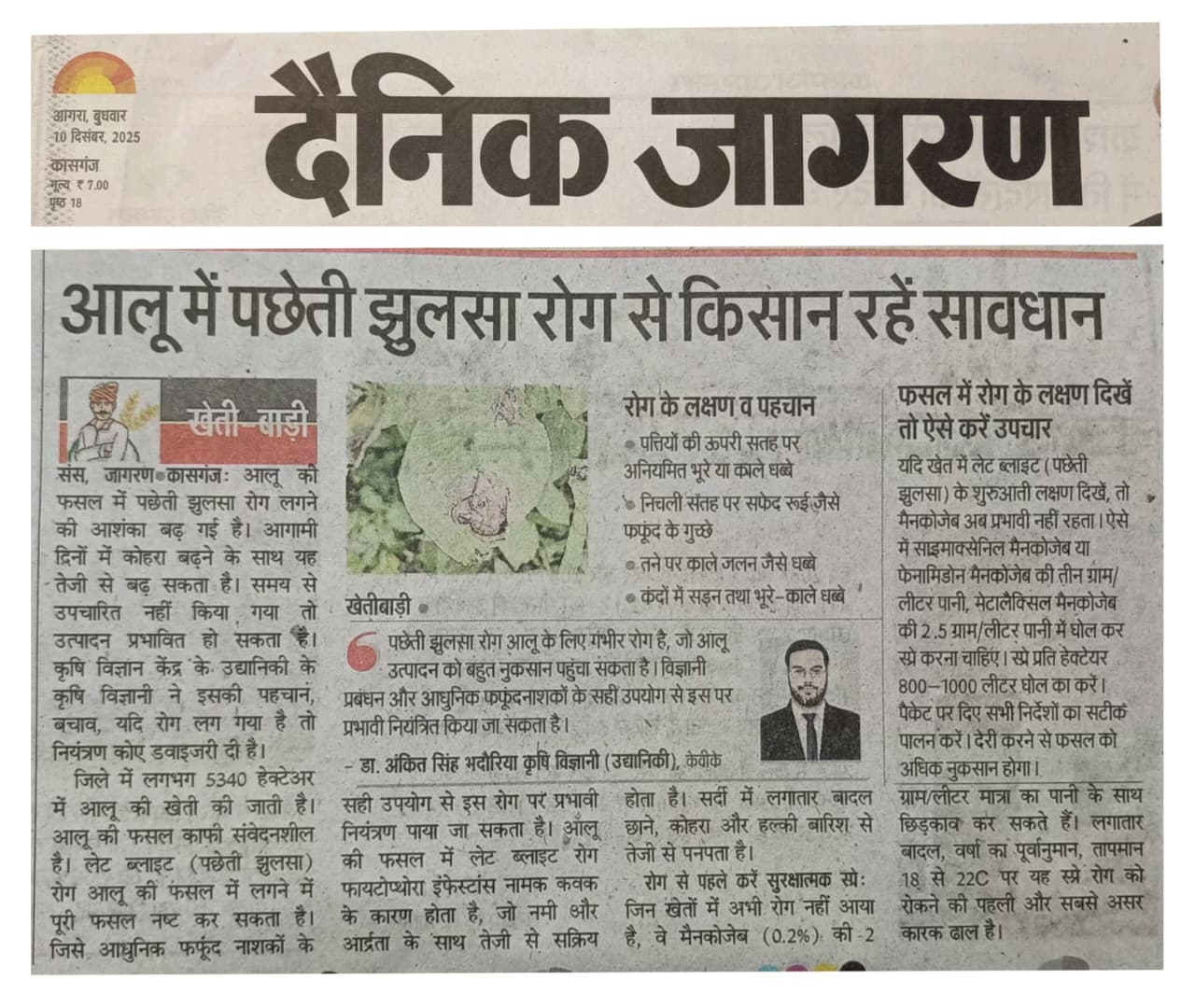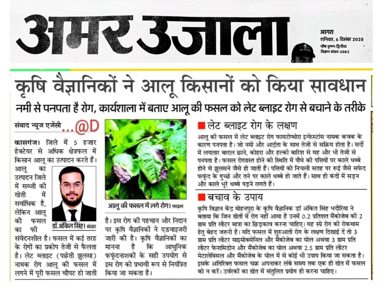 | 9 | आलू में पछेती झुलसा रोग से किसान रहे सावधान | कृषि वैज्ञानिक के अनुसार, आलू की फसल में खरपतवार, कीट एवं रोग मिलकर लगभग 40–45% तक का नुकसान कर सकते हैं, जबकि लेट ब्लाइट अनुकूल परिस्थितियों में यह नुकसान 100% तक पहुँच सकता है। इसीलिए समय पर रोकथाम और सक्रिय प्रबंधन अत्यंत आवश्यक है। | 2025-12-10 |
