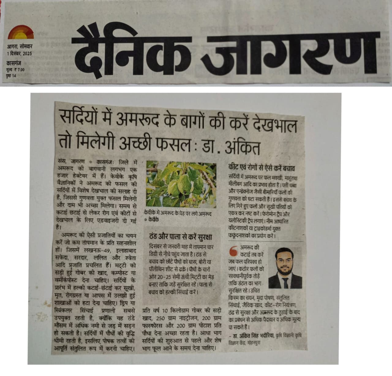 | 6 | सर्दियों में अमरूद के बागों की करें देखभाल तो मिलेगी अच्छी फसल | भारत में सर्दियों का मौसम अमरूद की गुणवत्ता और मिठास को बढ़ाने के लिए सर्वोत्तम अवसर प्रदान करता है। किंतु इस समय फसल का वैज्ञानिक और समन्वित प्रबंधन अत्यंत आवश्यक है। उचित किस्म का चयन, मृदा पोषण, संतुलित सिंचाई, जैविक खाद, कीट-रोग नियंत्रण, ठंढ से सुरक्षा और कटाई के बाद का समुचित प्रबंधन अपनाकर किसान न केवल अधिक पैदावार प्राप्त कर सकते हैं बल्कि बाजार में उच्च मूल्य भी अर्जित कर सकते हैं। अतः वैज्ञानिक दृष्टिकोण को अपनाने से अमरूद की सर्दियों की फसल किसानों के लिए एक आर्थिक वरदान सिद्ध हो सकती है । | 2025-12-01 |
