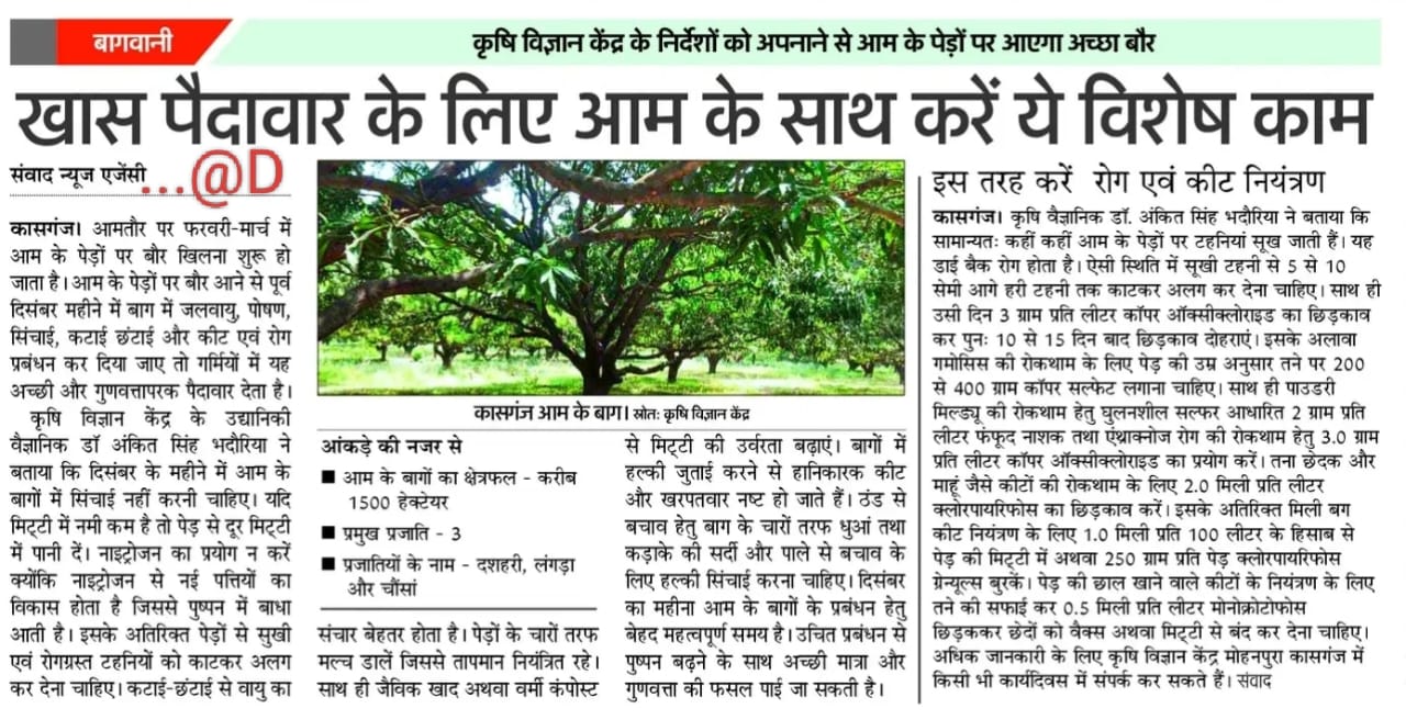 | 5 | आम के बाग में बौर आने से पूर्व दिसम्बर में बाग का प्रबंधन | उत्तर भारत में आम की खेती के लिए दिसंबर का महीना बहुत महत्वपूर्ण होता है। इस समय का उचित प्रबंधन आने वाली फसल में अधिकतम पुष्पन (फूल आने) और उत्पादन सुनिश्चित करने में सहायक होता है। इस प्रक्रिया में जलवायु, पोषण, सिंचाई, कटाई छंटाई और रोग कीट प्रबंधन जैसे विभिन्न कारकों का ध्यान रखना आवश्यक है। कीटों जैसे बोरर और एफिड के प्रबंधन के लिए क्लोरपायरीफॉस @ 2 मिली/लीटर पानी का छिड़काव करें। दिसम्बर माह में बाग की बहुत हल्की जुताई करें और बाग से खरपतवार निकाल दें दिसंबर के महीने में पेड़ों की सूखी, रोगग्रस्त और अवांछित शाखाओं की कटाई-छटाई करें फूलों की संख्या बढ़ाने के लिए हार्मोन/ कृषि रसायन का उपयोग प्रभावी होता है जैसे, पोटेशियम नाइट्रेट (1%) का छिड़काव करें, | 2025-12-12 |