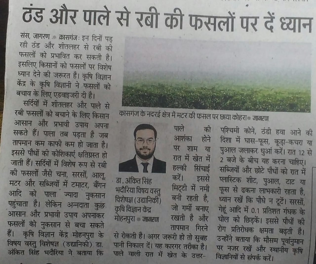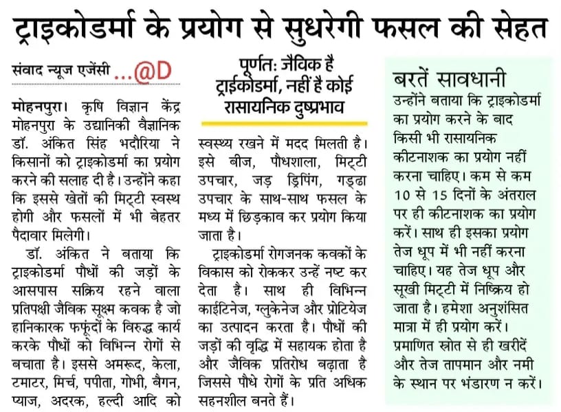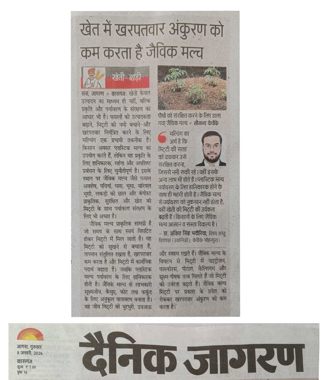| 7 | बंजर हो रही जिले की धरती, मृदा में पोषक तत्व कम होने से विशेषज्ञ चिंतित | आज दिनांक 05/12/2025 को चन्द्र शेखर आजाद कृषि एवं प्रोद्योगिकी विश्वविद्यालय, कानपुर द्वारा संचालित कृषि विज्ञान केन्द्र, मोहनपुरा, कासगंज में विश्व मृदा दिवस "स्वस्थ शहरों के लिए स्वस्थ मिट्टी" विषय पर मनाया गया। इस कार्यक्रम में विशिष्ट अतिथि के रूप में जिला क़ृषि अधिकारी डॉ. अवधेश मिश्रा, मुख्य अतिथि के रूप में अध्यक्ष/प्रतिनिधि जिला सहकारी समिति श्री नरेश नंदन, प्रभारी कृषि विज्ञान केंद्र डॉ. प्रण वीर सिंह, एडीओ एजी श्री भगवान सहाय, एडीओ पीपी इंद्रवीर सिंह, प्रभारी मृदा परीक्षण प्रयोगशाला श्री आदित्य शर्मा एवं विषय वस्तु विशेषज्ञ के रूप में डॉ. अंकित सिंह भदौरिया, डॉ. रितेश कुमार, डॉ. अदिति दत्त, डॉ. गौरव वर्मा, डॉ. सुशील कुमार एवं डॉ. आकाश आदि उपस्थित रहे। कार्यक्रम में सभी ने मृदा की कृषि में उपयोगिता, मृदा परीक्षण, जैविक खेती एवं प्राकृतिक खेती इत्यादि महत्वपूर्ण बिंदुओं पर प्रकाश डाला तथा मृदा की संपूर्ण जानकारी किसानों को उपलब्ध करायी। कार्यक्रम में किसानों ने काफी संख्या में उपस्थित होकर महत्वपूर्ण जानकारी प्राप्त की। | 2025-12-05 |